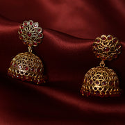 Enhance your ethnic look with these exquisite matte-finish jhumka earrings, adorned with vibrant ruby stones. The intricate craftsmanship and temple-inspired design add a touch of elegance and spiritual charm. Handcrafted from high-quality mixed metal and copper, these gold-plated earrings beautifully blend tradition with sophistication. Perfect for festive occasions, weddings, and cultural events, they offer a timeless appeal, making them a must-have addition to your jewelry collection.
